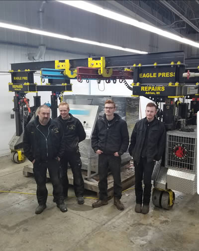 The rigging, machinery, and moving experts at Eagle Press Repairs have years of experience and state-of-the-art equipment to fulfill even the most challenging moving situation. For us, it is always a treat to watch how we take a customer's challenge and make it a joy to watch your investments being handled with care and finesse that owners trust to exclusively choose Eagle Press Repairs over and over again. Businesses have taken many videos and pictures to advertise the installation and procedures used to install equipment by Eagle Press Repairs. Check out some of our videos HERE to see the magic in action.